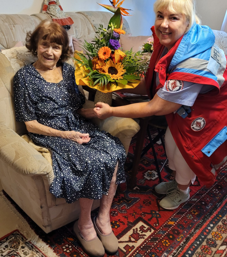 Rettungsverbandes ihr noch einen Blumenstrauß und eine Geburtstagskarte mit einem schönen Gedicht.